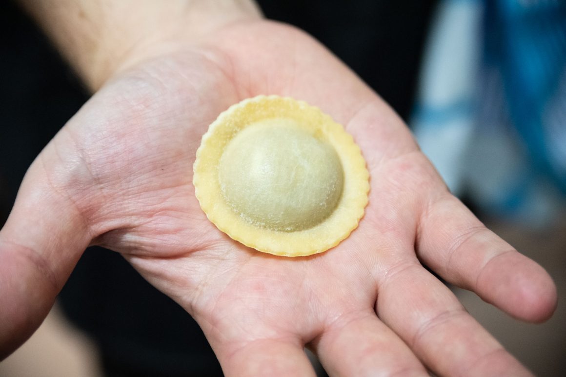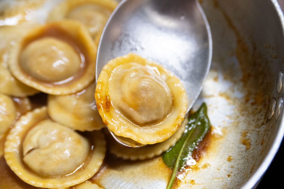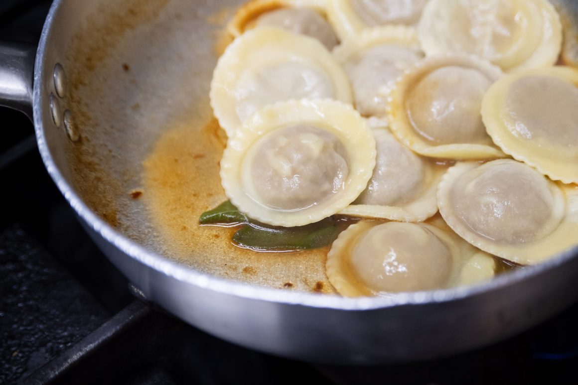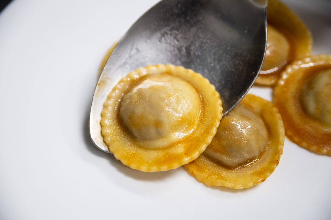 Il valore aggiunto di questo raviolo risiede nel ripieno che, per la sua preparazione, richiede un lavoro certosino. “Il ripieno è un vero e proprio patè di fegato – racconta Andrea Paleni, il cuoco – preparato facendo cuocere e brasare per bene i fegatini di pollo e anatra in padella con alcune aromatiche. Li sfumiamo quindi con il Marsala e li facciamo cuocere”. Con essi Andrea prepara un patè molto succulento. Una volta cotti in acqua bollente i ravioli vengono laccati in padella con burro, salvia e un po’ di fondo bruno, a ricordare il condimento per eccellenza del raviolo.