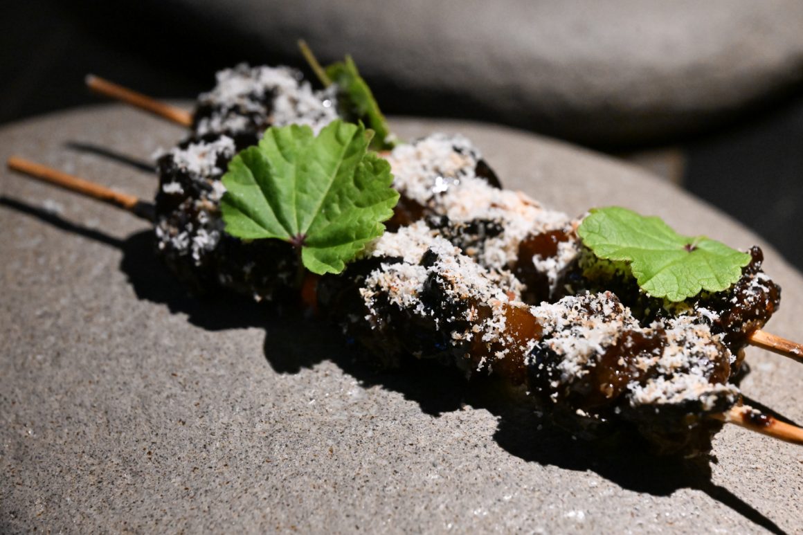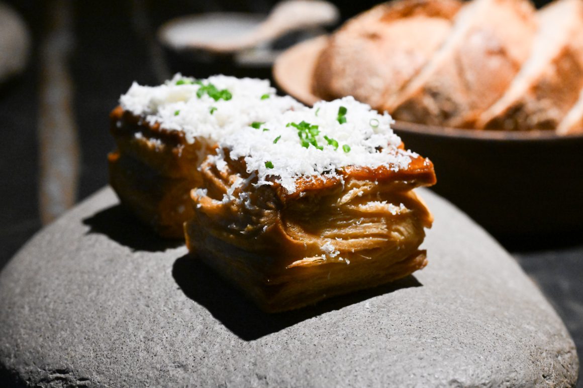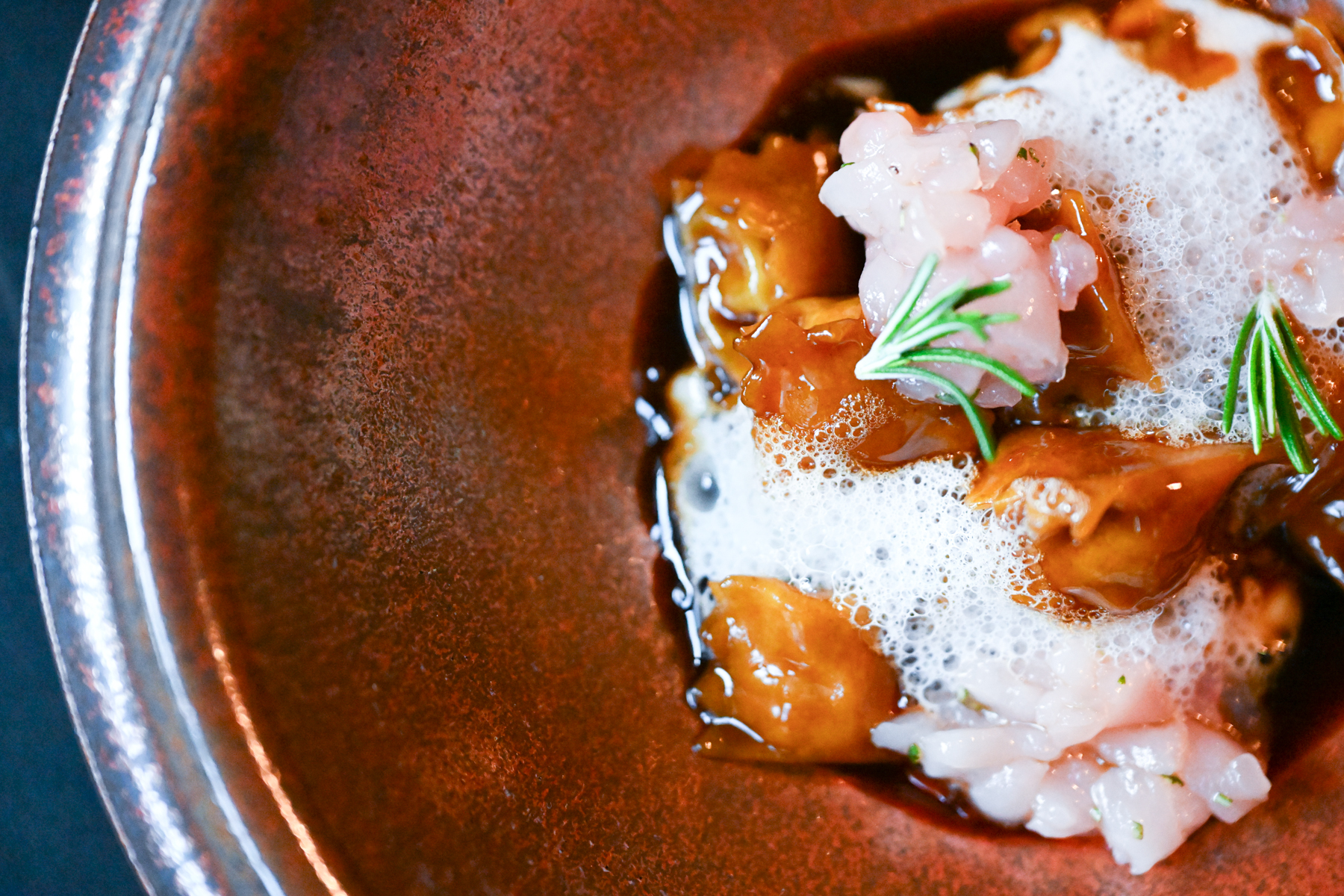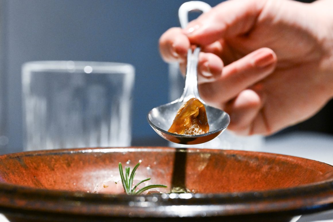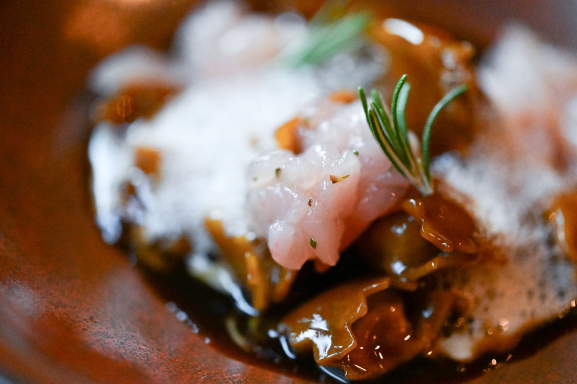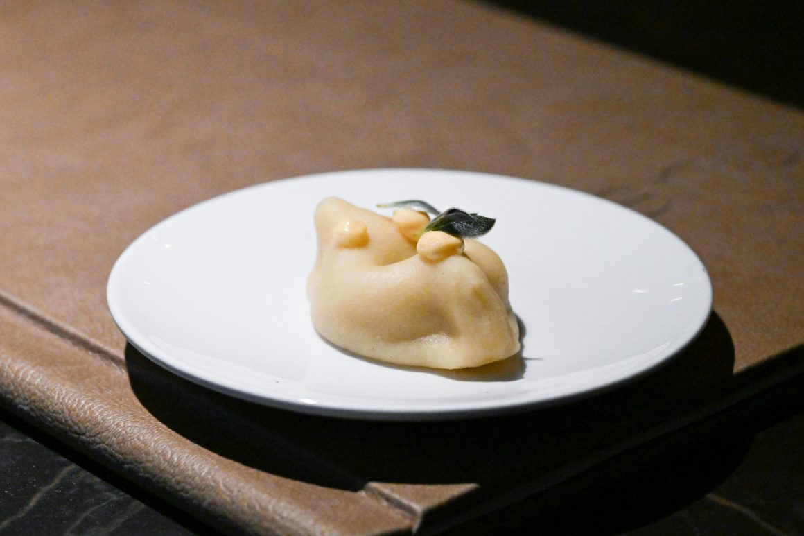 Dell’animale viene utilizzato tutto: cosce, sovra cosce e pancia vengono grigliate alla brace e poi rosolate al tegame con la cipolla dorata e pancetta bergamasca; una volta sfumato con il vino bianco, viene aggiunto il fondo, ottenuto con gli ossi dell’animale, e abbondante rosmarino. Viene quindi lasciato a cuocere sino a quando le carni non si staccano dagli ossi. Spolpato a mano, viene poi battuto al coltello con le sue rigaglie e altro rosmarino. Se ne prepara un ripieno custodito da una pasta all’uovo realizzata unicamente con tuorli uniti alle farine dell’Azienda Agricola Riboli di Nembro. Il plin viene servito con Agrì di Valtorta (in crema e aria) e controfiletto di coniglio in tartare (precedentemente abbattuto e trattato secondo la normativa vigente) a dare il tocco di originalità al piatto: non è comune poter assaporare, in sicurezza, il battuto crudo di coniglio, appena condito con un poco di rosmarino e l’olio extravergine di oliva dell’Azienda Agricola Il Castelletto di Scanzorosciate (Bg). Infine, è il momento della salsa al Macvin preparato dal sommelier Gianluca. Proprio questo è il file rouge che collega sala e cucina: il vino fortificato trae ispirazione da quello prodotto nella regione francese della Jura e viene preparato con mosto proveniente da uva americana di una vigna che conta almeno 80 anni e presente in pergola sulla bellissima terrazza del castello. Al mosto viene unita della grappa di Mosca di Scanzo, rimanendo poi ad affinare in una piccola botticella di legno. Una produzione minuscola, unica nel suo genere per un piatto che regala una bella nota acida che si sposa bene all’umami dato probabilmente dal fondo e dal ripieno, che ci sposta un po’ in Asia. Infine la dolcezza della battuta di coniglio, che ci riporta sempre a casa.