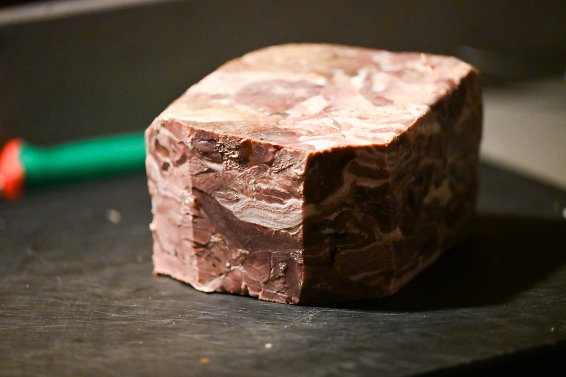 Come questo lesso di agnello di pecora gigante bergamasca. “La pecora e le sue carni, in casa mia fin da bambino, hanno sempre avuto un ruolo importante: il fratello di mio padre le allevava per passione. Quindi la pecora e, in particolare, la castradina, in casa erano quasi sempre presenti. La castradina, quando diventava troppo dura per essere mangiata tal quale, veniva bollita al fine di ridarle la consistenza adatta ad essere gustata” racconta Gianni. Il piatto di lesso di pecora nasce proprio dall’unione di questi ricordi e la voglia di proporre un piatto normalmente servito freddo e a base di suino, come la testina, ma interpretato in modo diverso. Nasce quindi questa terrina a base di pecora Gigante Bergamasca allevata a Clusone (Bg) da Massimo Balduzzi. Le carni di spalla e collo vengono dapprima salmistrate, marinandole con vino rosso e aromi, tra i quali alloro, chiodi di garofano e scorza di limone. Poi vengono cotte e pressate in terrina con poco grasso e poca cartilagine, essi servono principalmente a fare da collante e a regalare succulenza. Una raffreddata, prima del servizio viene tagliata e fette grossolane e a tocchetti, per essere quindi riscaldate al microonde. La scelta di scaldare il lesso non è casuale: si sfrutta il principio della cottura a microonde, che si basa sul riscaldare l’alimento agendo sulla sua parte liquida. Infine, la carne calda viene servita con patate Amandine, una varietà perfetta da servire lessa o al vapore perchè non si sfalda, e una salsa verde arricchita con giardiniera tritata, acciughe, pochissimo aglio e senape.