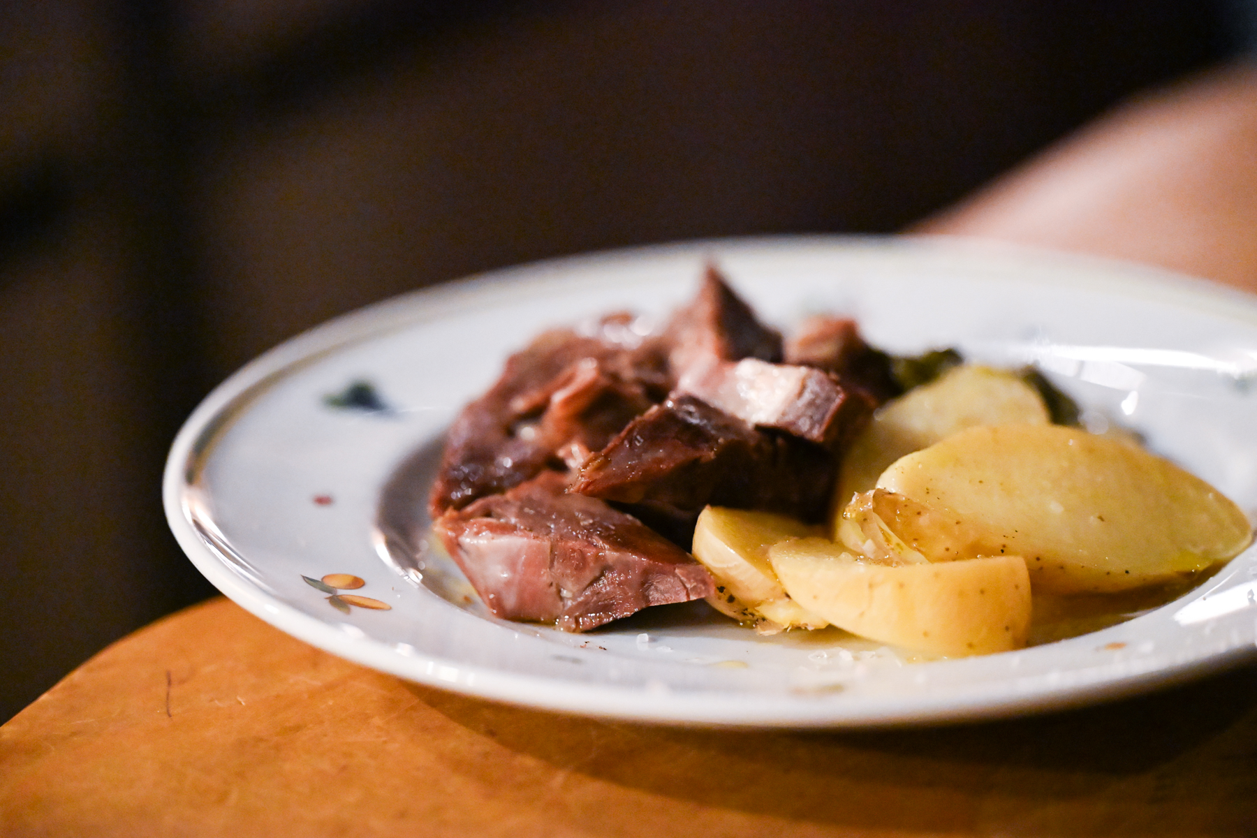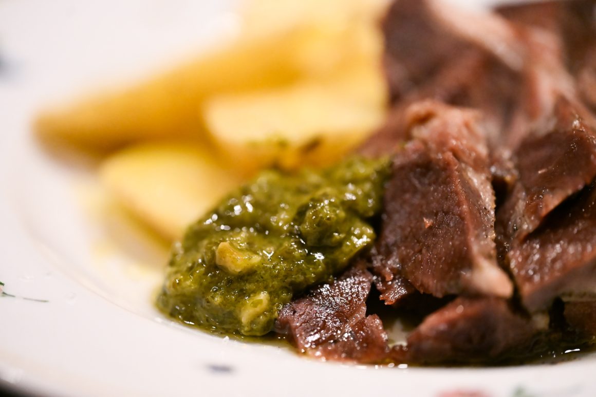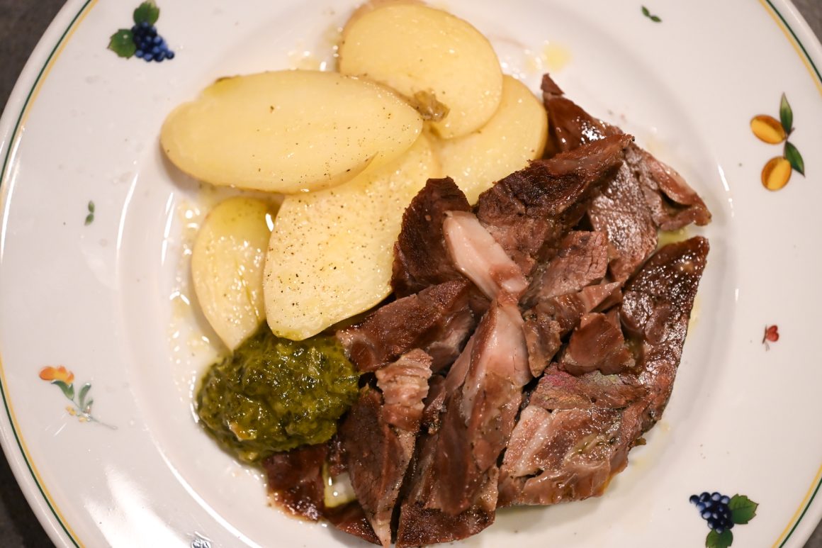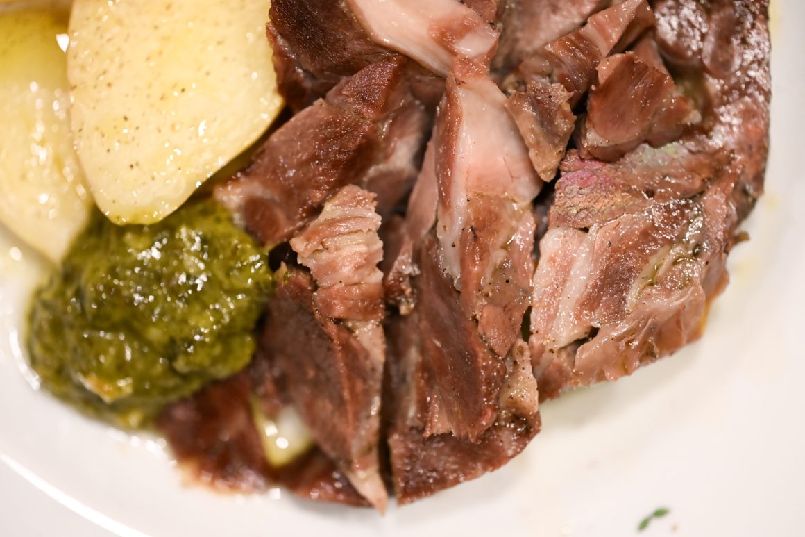 Carni morbidissime, dalla consistenza del lesso, ma con quella punta di freschezza che dopo ogni boccone invita a gustarne un altro. Una salsa verde molto ricca che accompagna la dolcezza di queste carni unita a quella delle patate.