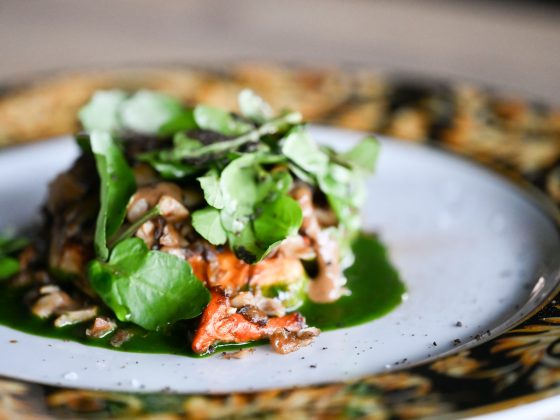 Inizio dal salmerino. Adoro l’affumicato e lo apprezzo ancora più se ben dosato, soprattutto su un pesce delicato e poco grasso come questo. La grassezza delle carni è determinante nell’assorbimento del fumo, per questo motivo è facile fare errori quando si è alle prese con una materia prima che ne presenta poco: spesso si esagera nell’affumicare per avere la sicurezza che il sentore di affumicato venga ben percepito, andando così a sovrastare qualsiasi aroma o sapore. Qui no. Il fumo viene utilizzato con misura e, unito alla marinatura, regala al salmerino un piacevole aroma. Dopo averlo tagliato e condito, Emanuele lo serve con le sue uova, dal sentore marino lievissimo, ma dalla bella consistenza e sensazione tattile sotto ai denti (scoppiettanti!), poi la crema di piselli dolce e una punta di rafano che spinge fino al puro godimento. Un piatto ben riuscito, equilbrato, buono.